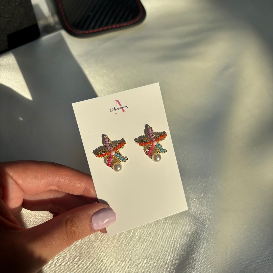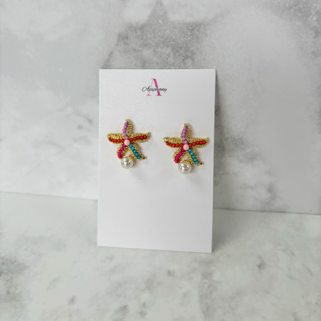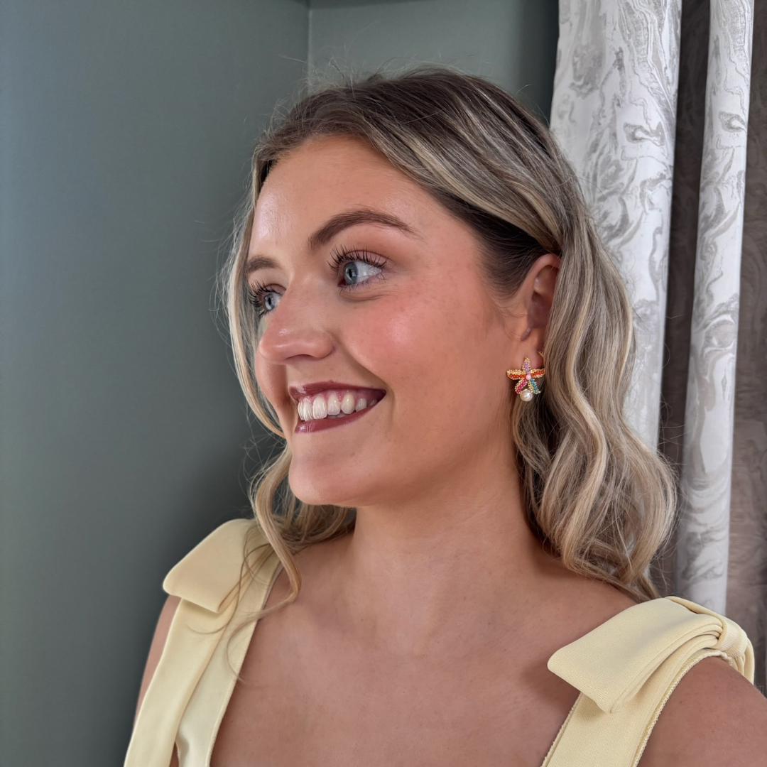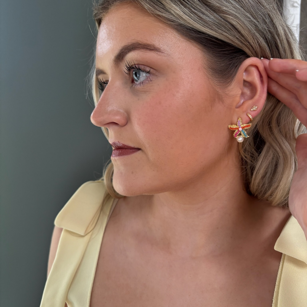 Summer star earrings with colourful beading and pearl drop. Small stud and very lightweight.
