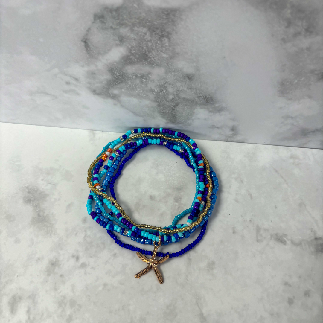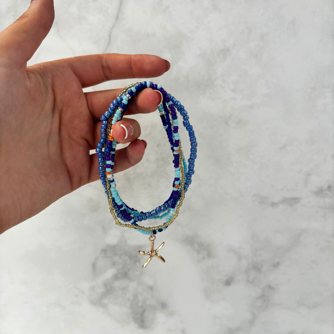 6 beaded anklets in blue and gold